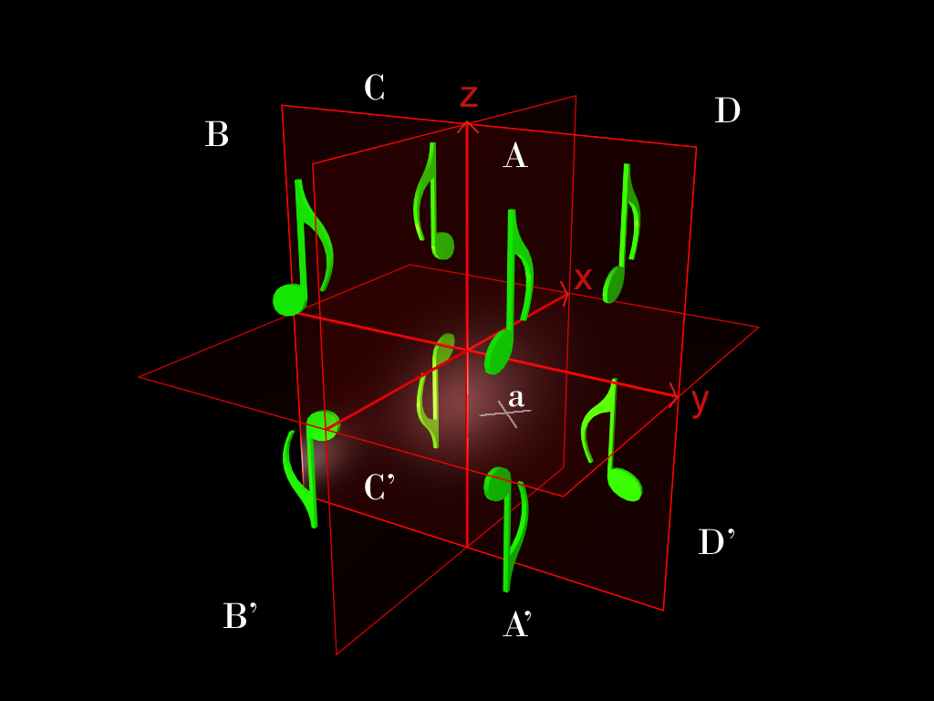 This third toy is a more advance game using electric and magnetic fields to define symmetries within the notes at every quadrant. The final position should show all notes associated by some kind of symmetry, for example, mirror, inversion, rotation, translation, or multiple transforms.