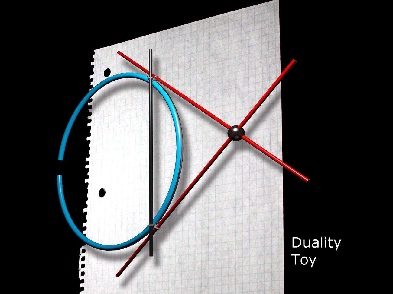 This toy can be used to teach Apollonius notion of duality, using the simple construction of a hollow tube, three moving pieces, and three cafeteria straws. The motion of any part affects the other parts maintaining the duality relation, as can be seen on the close-up in the next illustration.